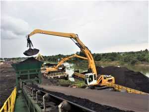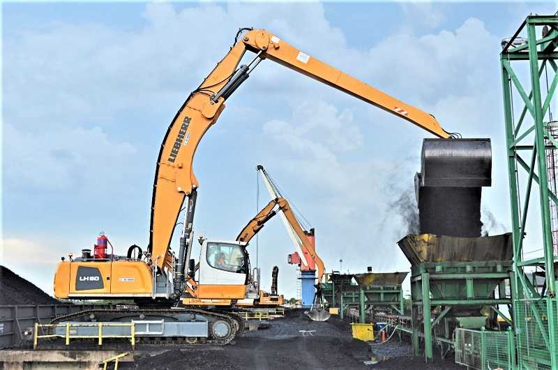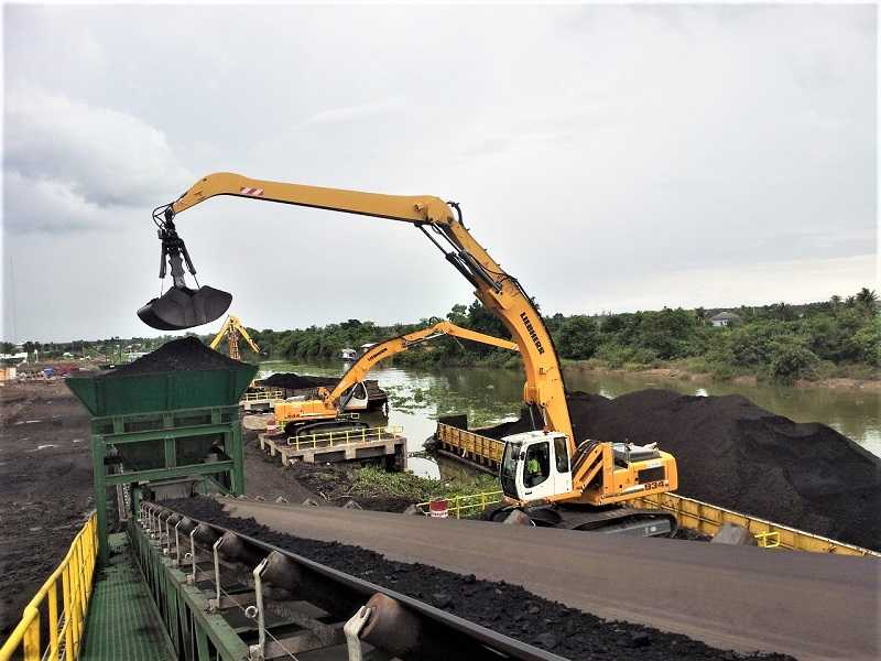 Liebherr material handler memindahkan batu bara dari tongkang ke conveyor (Foto: Multicrane)