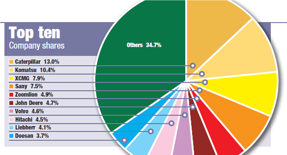 John Deere turun dari nomor tiga ke nomor enam dan nomor tujuh hingga sepuluh semuanya turun satu peringkat dibandingkan tahun lalu, dengan Volvo CE di peringkat tujuh, Hitachi Construction Machinery di peringkat delapan, Liebherr di peringkat sembilan dan Doosan Infracore di urutan sepuluh besar.